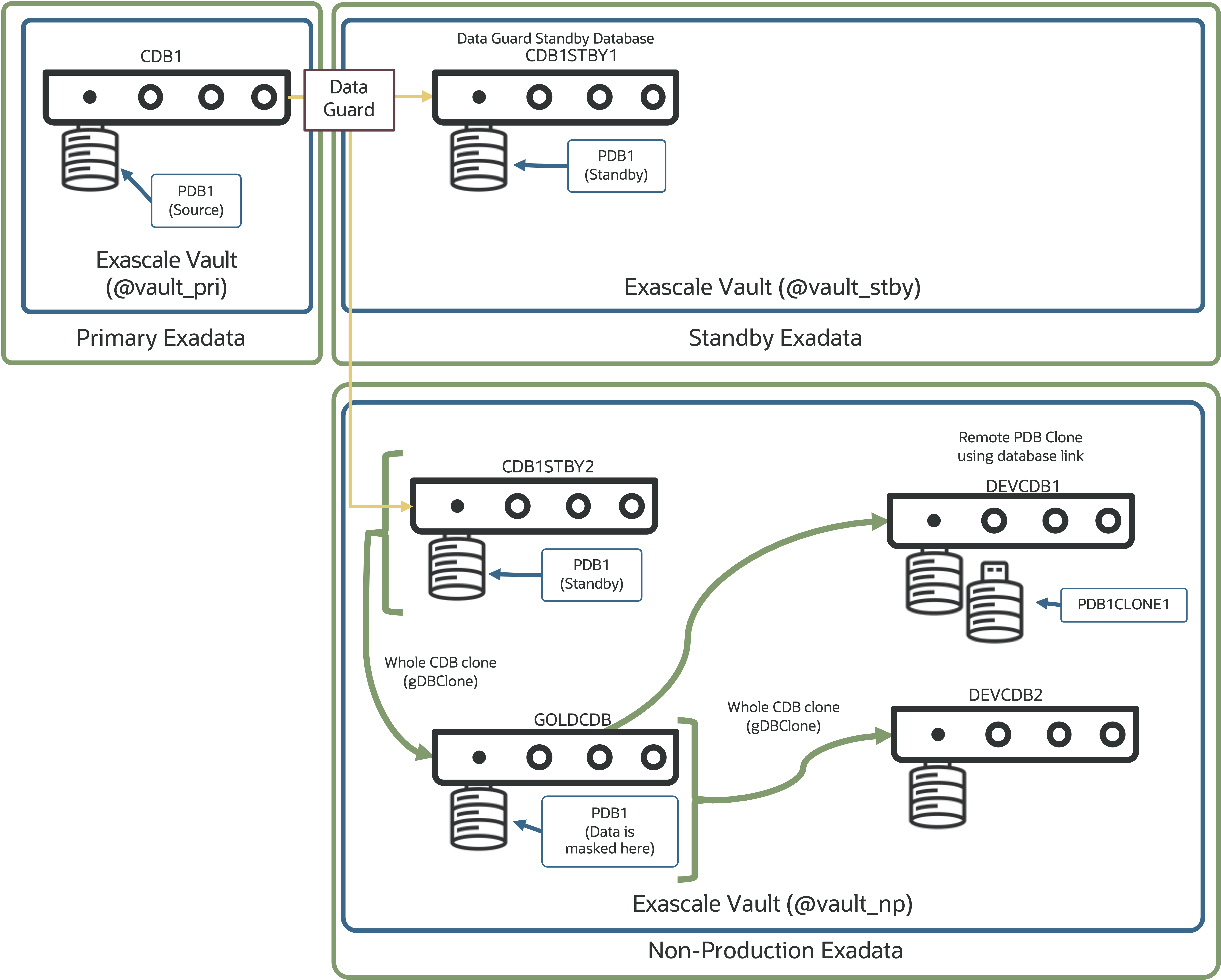 This needs more context. The background is that an organization plans to set up a primary database system and a DR system. They also have a nonprod (dev/test) environment in which they want production-like data to make development and testing more robust. They want to create multiple clones of a gold-image nonprod database so that, when they provide production-like data to developers, they can mask the data once and clone it many times.