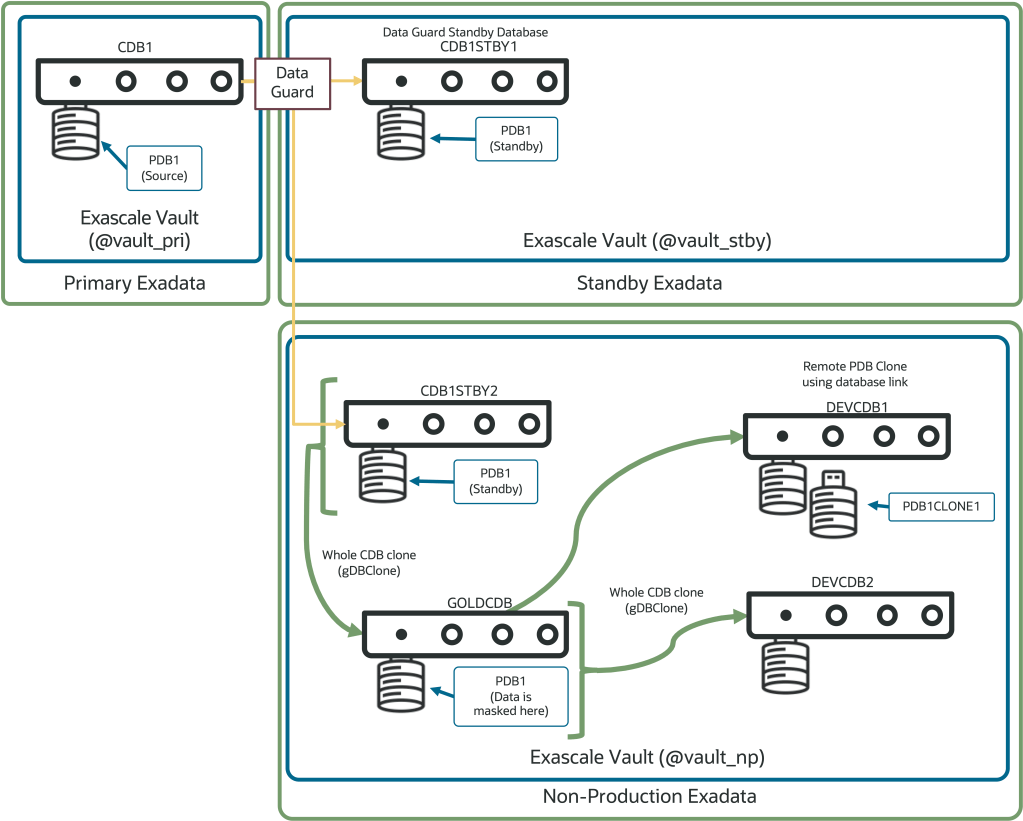 First, a Data Guard standby database can serve as the source for subsequent database clones on Exascale. Oracle recommends using a secondary standby database for this purpose, to separate the DR function from cloning. In other words, use at least two standby databases—one for DR and one as the source of your clones.